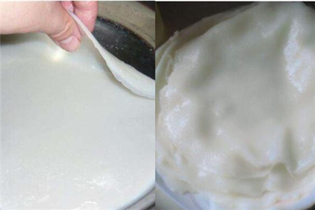 将粉水放在锅中静置5个小时左右,这个时候粉水已经上下分层了,将上层的清水去除,留下下面的液体状沉淀物。准备一个大碗,在碗底和四周都刷上食用油。