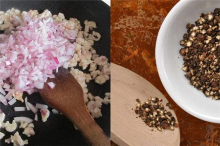 将洋葱、大蒜切成碎末,黄油放入锅中加热。等黄油受热变成液体后加入洋葱和大蒜进行翻炒。将黑胡椒颗粒用研磨器磨成碎末加入锅中,加入300ml的清水开小火熬煮。