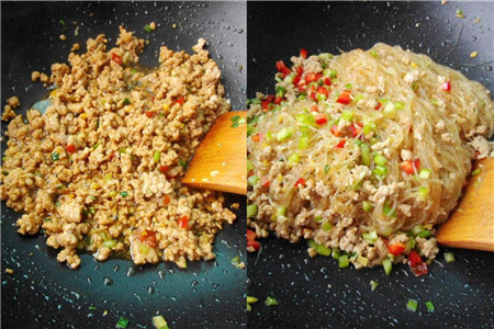 这个时候就可以兑水了,注意水不要放的太多,否则会使味道变淡。放完水之后把粉丝下到锅里,稍微煮一下。等到水快干的时候,我们就可以再次进行翻炒了。记得加上鸡精和香油,还有青椒末。等到汤汁收干净了,粉丝就可以出锅了。这样,一道蚂蚁上树就顺利完成了。【女物原创未经允许,谢绝转载!】