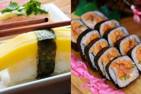 说到日本料理大部分人都会想到寿司。这次教大家两种寿司的做法。先在电饭锅中放入一些白米和糯米,一起煮好之后备用。将三文鱼等食材切成薄片。再用盐、白醋、白糖以及两滴柠檬汁拌匀制成寿司醋。用剪刀将紫菜剪成大致像手指一样粗的长条。在米饭中加入适量的寿司醋拌匀。再用手蘸取适量寿司醋,取煮好的米饭,捏成饭团。在饭团上铺上食材。用处理好的紫菜捆绑住饭团即可。另外一种寿司的做法和上一个基本相同。不同之处在于紫菜不需要处理。直接在整张紫菜上铺上食材和米饭,用专门制作寿司的竹帘卷起之后压紧实。切块即可。【女物原创未经允许,谢绝转载!】