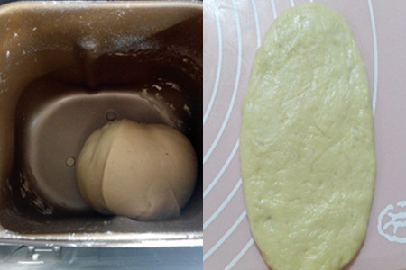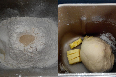 这时候就可以启动面包机,揉面大概15分钟,加入黄油,黄油不用加热融化,直接呈块状放进去就行。再次开启面包机揉面,这次的时间要比上一次稍微长5分钟,也就是揉面21分钟。之后留在面包机中让面团自行发酵。发酵时间比较长,约70分钟,发酵之后面团的体积就是原来的两倍了。