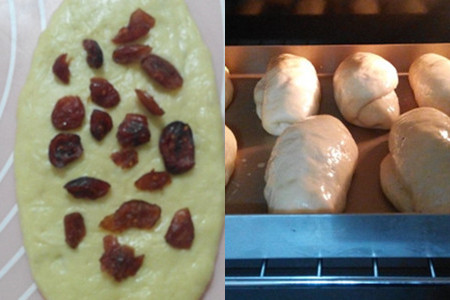 取出面团揉成面包的形状,在平板上将椭圆的面团碾压成饼状,再把蔓越莓干放到上面,用棒子卷起饼块,卷好之后统统放入烤炉。在烤箱中进行二次发酵,这样面包基本完成。在表面上涂上鸡蛋液,预热烤至20分钟,蔓越莓面包即可新鲜出炉。【女物原创未经允许,谢绝转载!】