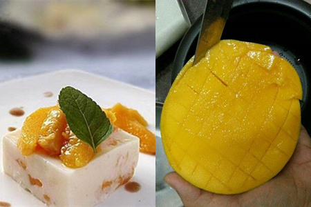 第一款点心是粒粒芒果椰汁冻糕。需要准备的食材有一个台湾大芒果、二百五十克新鲜牛奶、一百克椰浆、十五克鱼胶粉、三十克白砂糖、二十克清水。芒果以及椰浆的添加量可以按照个人的喜好适量增减。