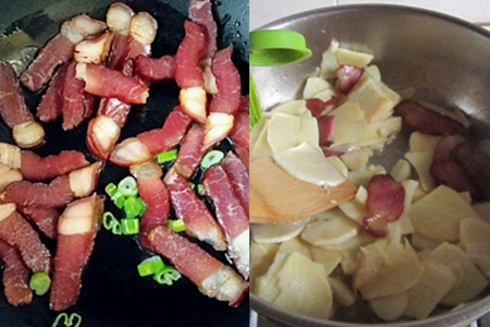 这时候将锅放好,把腊肉放上去煸出油,这样就不用放油了。等到腊肉出油之后把准备好的姜蒜和辣椒段一起放进去翻炒一下,接着再放入冬笋片一起翻炒。