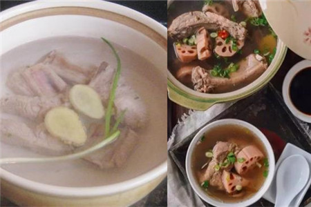 把排骨放入已放有凉水的砂锅中,倒入适量的料酒,然后砂锅开大火烧水,同时也把汤锅添半锅水烧开。水烧开后两分钟,把排骨捞起来放进汤锅中,之后再放进切好的葱末和姜末,还有十三香。然后从碗中捞出浸泡着的莲藕块,再放入锅中,盖上锅盖后等锅里的水烧开,再转小火,慢炖一个小时左右。快出锅时,则把香油、盐、鸡精放入少许,用来调料。