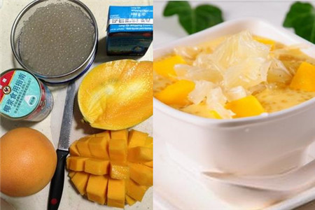 降温后,先后加入适量的三花淡奶和椰浆。之后放入芒果汁,并搅拌均匀,试味道,若不够甜。可再加糖调和一下。然后加入准备好的西柚肉粒、芒果小方块,等冷冻后就可以吃了。小编我先介绍这三样甜品,大家学到了吗?【女物原创未经允许,谢绝转载!】