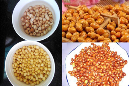 两者一定要分开炸,因为它们熟透的时间不一样。将炸好的花生和黄豆盛在碗中,加入适量的食盐拌匀,放到一边备用。