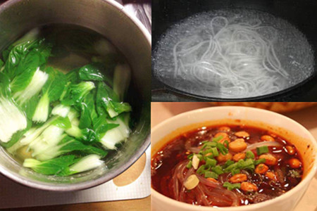 第四步,煮红薯粉。将清水加入锅中,大火烧开,将红薯粉倒入锅中待红薯粉完全熟透再将它捞起来放入冷水盆中冷浸一下,这样会让红薯粉的口感更加Q弹有嚼劲。这里的冷水应是事先准备好的冷开水。将冷浸过的红薯粉捞起来放入做好的面汤中,喜欢吃蔬菜的朋友可以在锅中下几片青菜叶,点缀在粉丝上好看又好吃。