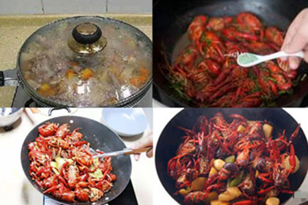 第四步,调味。煮制完成后,开锅,小龙虾继续翻炒。可以视个人喜好加入切好的黄瓜和芹菜条,继续翻炒五分钟,加入鸡精翻炒,锅内汤汁炒干就可以出锅了。