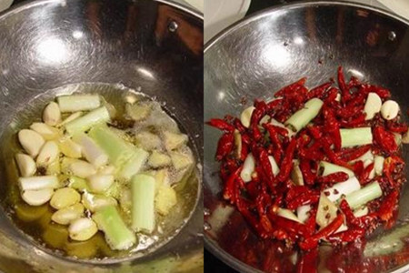 第三步,炒制麻辣小龙虾。先在锅中倒入适量的油,并将大葱生姜大蒜一并倒入,待油烧热后,将掰开的干辣椒和花椒八角以及食盐放入锅中一起大火翻炒。这里需要注意的是,小龙虾带着厚重坚硬的外壳,不容易入味,所以调料品都要适量多放一些,也可以加入一勺黄豆酱。