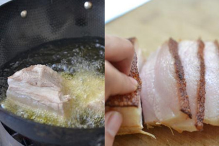 第三步,在锅内倒入适量的油,待油烧热以后将五花肉倒进去,五花肉在闷炸的时候会爆油,所以要盖上锅盖,防止热油飞溅烫伤皮肤。将炸制好的五花肉沥干油分并切成0.8-1厘米厚的薄片。