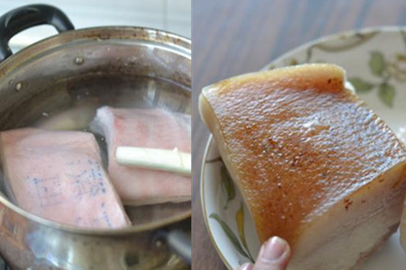 第二步,处理五花肉。五花肉因为大部分是肥肉,所以需要经过焯水油炸,去除肉油并且让肉质变得紧致。取五花肉适量放入锅中,加入生姜、小葱和适量的料酒去腥,再加入焦糖和老抽上色,改变肉白花花的颜色,更加好看。往锅中加入适量的水,盖上锅盖大火煮大概45分钟,将五花肉捞起来并用绳子将肉吊挂起来,放在通风处风干。