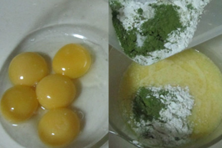 放在一边的抹茶粉和低筋面粉可以派上用场了,将它们放在一起搅拌均匀了。加入到刚刚弄好的蛋黄糊中,进行翻拌搅匀了。末尾,将这些倒入到刚才的蛋白糊中,用刮刀快速的搅拌,让它们完全融合了为止。做好这些之后,就可以把它们放到烤箱里面了,处理好的面糊,放入带有烘焙纸的盘子上,放入预热好的烤箱中,温度大概控制在170度这样子就可以。