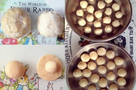 第一步,做蛋黄酥皮月饼的馅儿。蛋黄酥皮月饼也可以做多种口味的馅儿,这里以经典的豆沙蛋黄馅儿做例子给大家讲解。首先将豆沙搅拌揉捏,视制作月饼的个数,将豆沙分成均匀的小块。将豆沙搓成球形并压扁成饼,取出一颗熟蛋黄放在豆沙饼上,用豆沙将熟蛋黄包裹起来。每一个都这样做好,放到一旁待用。