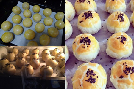 烤箱需要预热,预热好了以后将烤盘放入,200度烤20分钟,月饼微微变色,这时取出烤盘,再次刷上蛋黄液,将烤箱温度调到220度再烤15分钟左右,这时月饼的颜色加深了不少。关掉烤箱电源,蛋黄酥皮月饼就做好了,可以出炉了。