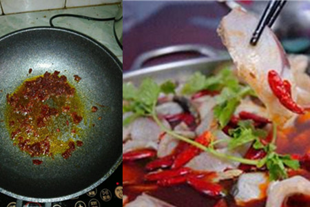 5、在炒锅之中下入适量的油,油温烧热至七八成时。倒入适当的干辣椒进行翻炒,再加入事先准备好的辣椒酱小火翻炒出红油。这时候,放入切好的葱姜蒜片,香味散发后,把鱼骨放入锅中进行充分地煸炒。鱼骨炒至变色后,往锅中倒入适量的水,大火煮开冒泡后,改为中火继续煮上五分钟。再把鱼片一片片夹入锅中,鱼片煮熟后既可以关火食用了。