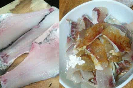 4、把草鱼剩余的鱼骨剁成大小适当的块状,同样用盐和料酒进行腌制。往腌好的鱼片里逐一加入干淀粉和适量的清水,用筷子来搅拌均匀。