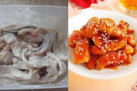 5、炸鱼片前,先将鱼片均匀地裹上一层淀粉。在炒锅中倒入适当的油,油温烧热至七八成后。先将鱼头和尾部逐一放入锅中油炸,鱼尾要立起油炸,以免影响整体的造型。把炸至金黄的鱼头和鱼尾捞出,摆在盘子的前后。把鱼片下入油锅之中,炸至表面呈现金黄色泽,便可捞出沥干多余的油,摆在鱼头鱼、鱼尾的中间。