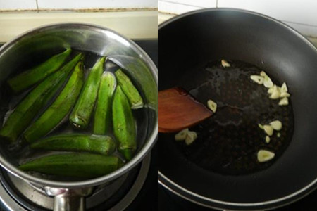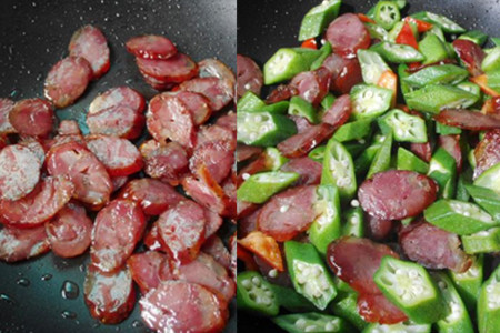腊肠洗干净切薄片,大蒜去掉蒜衣切成片。秋葵洗干净,用开水烫三十秒后盛出锅,过一遍清水,滤干水分,切段待用。炒锅加适量油,烧热,下蒜片爆香,放入腊肠片翻炒。