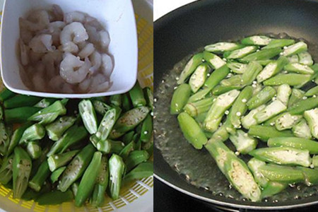 虾仁用少许盐、胡椒粉和白葡萄酒腌制十分钟。秋葵洗干净去掉尾部,切成片。锅里加清水,大火烧开,倒入切好的秋葵,秋葵煮变色后捞出锅,用凉水冲洗一下,滤干水分备用。
