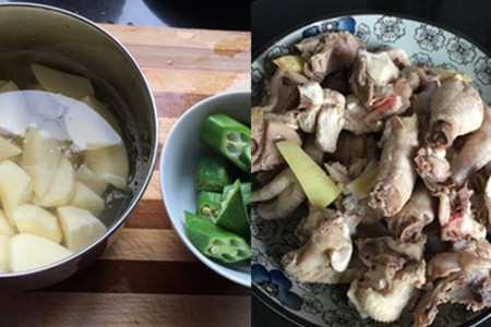 土豆削皮切方块,秋葵洗干净切段。三黄鸡块洗干净,冷水下锅,加少许姜片,大火煮开后捞出锅,用清水冲洗干净待用。