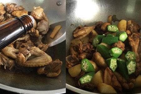 倒入适量开水,大火煮沸后转小火,加盖焖煮。鸡块煮了十五分钟后,开盖,放入土豆块,盖上盖子继续焖。等土豆焖软之后,放入切好的秋葵,再煮两分钟后收汁即可。【女物原创未经允许,谢绝转载!】