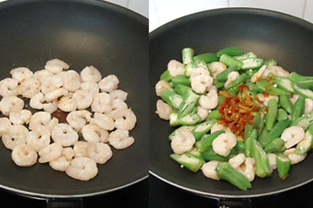 食材:秋葵300克、虾仁300克、橄榄油、水淀粉、白葡萄酒、胡椒粉、盐、辣酱、白糖。