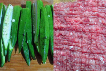 秋葵挑选个头小一点的,口感比较脆嫩。秋葵用水洗干净,切掉头部,一切为二。猪瘦肉洗干净,剁成肉末。