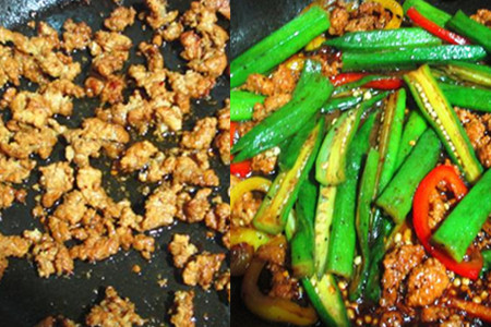 热锅凉油,放入剁好的肉末煸炒,一边翻炒,一边往锅里加辣椒粉、孜然粉和酱油。肉末炒熟之后,关火,盛出锅待用。彩椒洗干净,切成丝。锅里倒油,烧热,放入彩椒丝爆香,接着放入切好的秋葵,大火翻炒。秋葵炒软之后,倒入炒好的肉末,一起翻炒。翻炒片刻后,依次加入食盐和鸡精,炒匀后盛出锅即可。