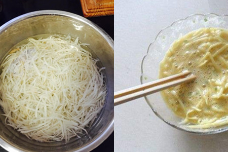 沥干水的土豆丝放进去,然后打入鸡蛋,再放入适量的精盐、五香粉、蚝油和鸡精进行调味。加入清水,慢慢搅拌,可以加入一些葱花,味道会更好,将土豆丝都尽量的包裹上面粉,这样做的时候不会散开。取平底锅,加热放油,然后用勺子取出适量的面糊倒入锅内,用铲子慢慢摊开,注意火候,小心不要弄糊。