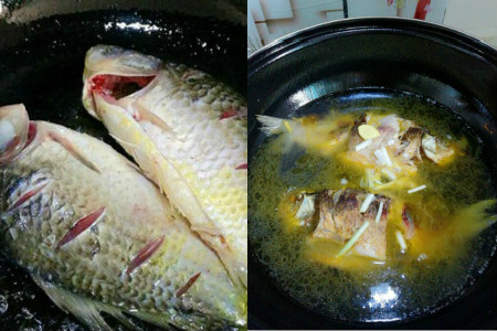 做法如下:将鲫鱼处理干净,用刀背在鱼的身上拍一拍,然后撒上一点盐,放置10分钟左右。这时候可以将葱切成段,姜切成片。铁锅加热,然后倒入一些菜籽油,将刚才腌好的鲫鱼用厨房纸擦干后放入锅中,再放入一些姜片,然后煎鱼,两面都煎成金黄色的时候就可以了。