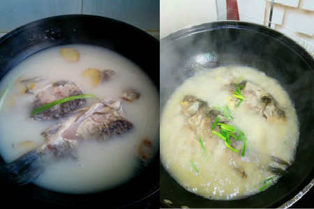 将锅中倒入清水,水量要没过整条鱼,如果想要多喝一些汤水,可以多加水。放入大葱和剩下的生姜片。调成大火,将水烧开之后转成小火熬制。不断熬制,直到汤汁变得浓郁,颜色呈现出奶白色就好了,可以撒上一些鲜葱的葱段。这样一碗鲜美可口的鲫鱼汤就做好了。