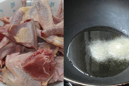 鸽子宰杀好,用水洗干净,剁成适当的大块。炒锅内注入适量油,烧热,加入两勺白砂糖,小火慢炒至溶化。