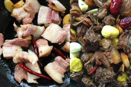 食材:板栗100克、乳鸽2只、五花肉100克、红枣10个、大蒜、生姜、干辣椒、白砂糖、胡椒粉、盐、生抽、老抽、料酒、花生油。
