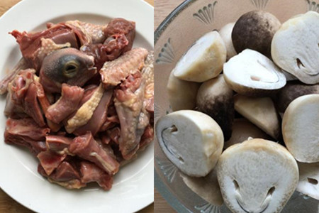 鸽子洗干净剁成小块,草菇洗干净切成两半。