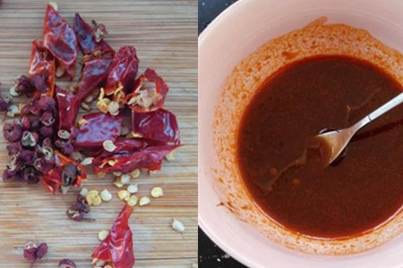 干辣椒洗干净剪成段。各取适量的海鲜酱、柱候酱和豆瓣酱于一个碗里,加两汤匙清水,搅拌均匀,待用。