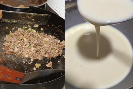 第四步,调制肉馅和面糊。将沥干水分的卤肉切成小块,再剁成肉泥放入碗中,加入适量的食盐、白糖和鸡精调味,这里调味迎合自己口味即可,将卤肉和佐料搅拌均匀放到一旁待用。取一个干净的碗,在碗中倒入适量的清水和食盐,加入适量的面粉,用筷子迅速搅拌成面糊,面糊要粘稠而没有颗粒感,可以多搅拌一下,让面粉和清水充分融合。