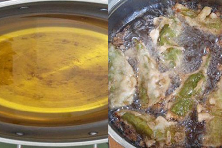 用筷子夹一根灌好肉的尖椒放入面糊中,用筷子翻动尖椒,让尖椒沾满面糊。将沾满面糊的尖椒放入到油锅中,中小火油炸,并用筷子翻动尖椒,让尖椒受热均匀。尖椒炸好后表面的面糊呈现出好看的金黄色,这时候将尖椒捞出放到铁篮子里沥干油分或者放在吸油纸上稍微吸一下油分就可以装盘上桌了。