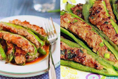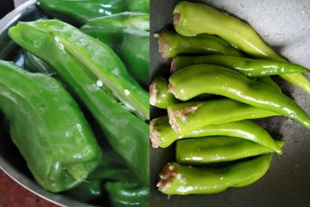 第五步,灌肉。用勺子取剁好的卤肉放入处理好的尖椒中,尽量让卤肉填满尖椒,不留空隙,但也要注意卤肉不要放多了避免尖椒裂口太大造成肉馅儿外露。