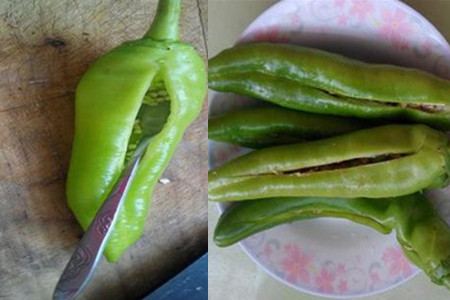 第三步,处理尖椒。先将尖椒清洗干净,沥干水分。取一个尖椒,用刀将尖椒的中间划开一道口子,再用长柄的勺子将尖椒里面的白籽和白筋掏空。这里需要注意,刀子划开的口子不能太深,不然会破坏尖椒的形状,影响美感。