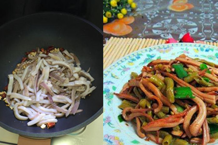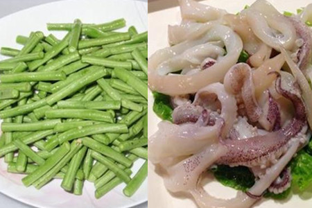 在选材的时候需要注意,豆角要用手指甲掐一下,能够轻易掐断说明豆角比较新鲜比较嫩,这样的豆角在制作干煸豆角的时候才容易熟,而且好吃。鱿鱼选择稍微大一点的鱿鱼,便于切丝,还要注意选择新鲜没有异味的哦。