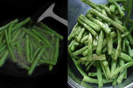 这里需要注意,整个炒豆角的过程中是不能加入一滴水的,不然豆角就会变软,影响干煸豆角的口感,害怕糊锅可以稍微多放一点油。豆角炒好以后装入盘子中,放到一旁待用。