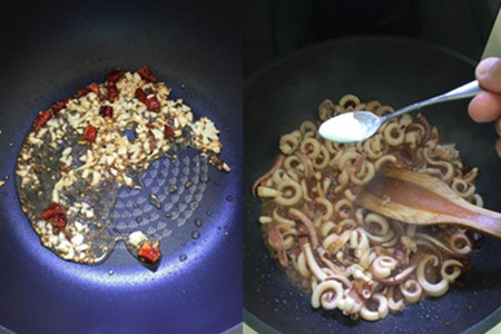 第四步,炒鱿鱼丝。将锅清洗一下,烧热,将切好的生姜、大蒜,以及辣椒末倒入锅中,翻炒至飘出香味和辣味。将腌制好的鱿鱼丝倒入锅中并迅速用锅铲翻炒。鱿鱼丝滑嫩Q弹,炒制的时候会卷成小卷,非常可爱。鱿鱼丝翻炒至7分熟就可以了。这里一定要把握好火候,不能将肉炒老了,也不能抄得太生。