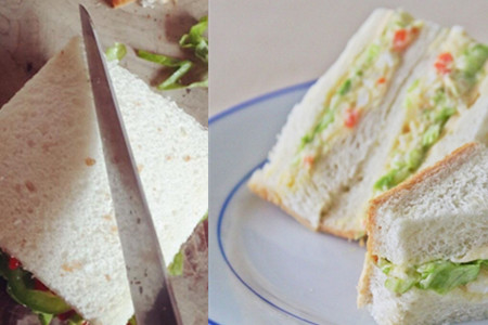 在这里需要注意的是,有一些想要减肥的人士可以选用一些荞麦的三明治,这样的三明治对于减肥人士是很有帮助的。通常我们在制作三明治的时候都会将将面包的边切掉,因为它的边容易影响口感。接下来,我们需要在三明治上面涂上一层沙拉酱,我们可以用刀背来涂,这样可以涂得更加均匀。