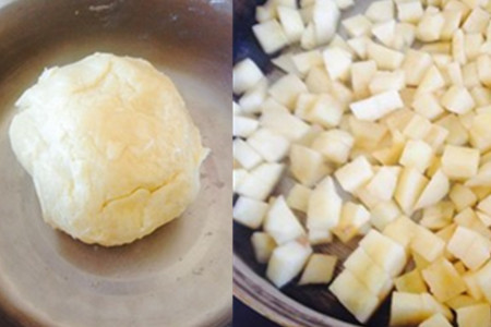 将揉好的面团裹上保鲜膜,然后让到冰箱中均匀发酵,至少要冰箱中放置一小时。然后将苹果洗干净,并切成丁(小一点口感会更好)。然后将黄油融化,将苹果倒入,不停翻炒。想要让苹果快速出水,并且香甜可口,就在加入10克的白糖。