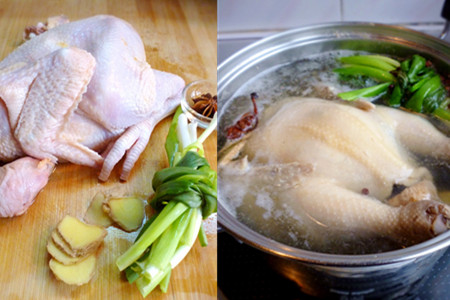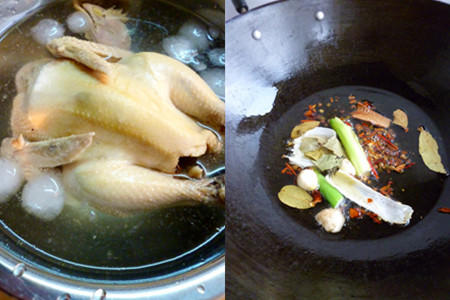 把鸡洗干净,去除鸡尖。大葱打结,生姜切片待用。准备一口锅,加入适量的清水,把一整只鸡放入锅中,开火煮开,用勺子把锅里的浮沫撇掉。然后往锅里加入料酒、葱姜、大料半个、花椒数粒,盖上盖子煮开十五分钟,关火,先别开盖,继续焖十分钟再开盖。