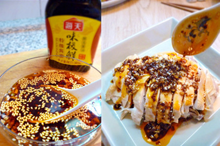 然后用漏勺把油中的香料统统捞出,把锅里的油倒入辣椒碗中,盖上一个碟子焖片刻,那么红油就做好了。接着在红油碗中加入蒜蓉、酱油、醋、糖、盐、少量鸡汤,搅拌均匀,调成调味汁。