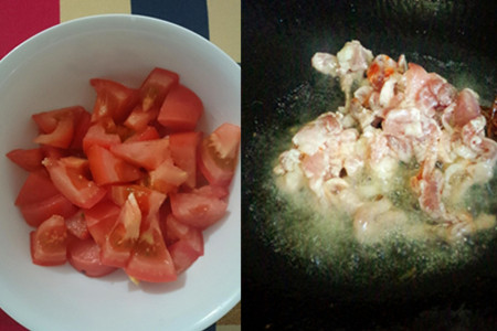 加入择断的扁豆,开大火翻炒,扁豆炒至变色后,加入切好的番茄块,一起翻炒,将番茄炒出汁。