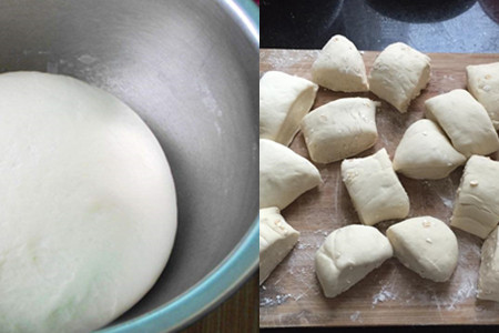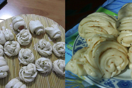 面团发好之后将整个面团切成一张饼,上面刷上油和盐,再放上葱。之后再把这张大饼揉回面团。揉好之后把面团切成一个一个小块的面团,注意切块的时候不要切得太大也不要切得太小,以免包花卷的时候不好包,最后蒸也不容易蒸熟。
