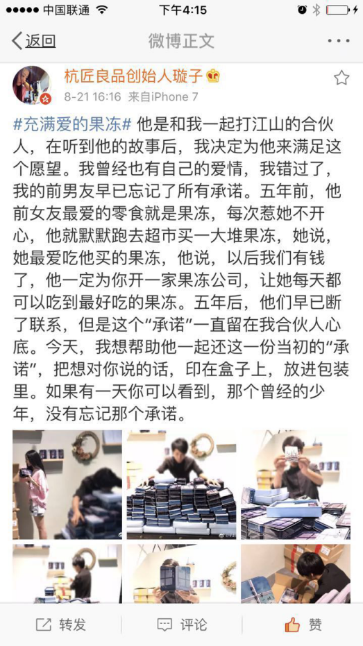 微博写道,五年前,他前女友最爱的零食就是果冻,每次惹她不开心,他就默默跑去超市买一大堆果冻,她说,她最爱吃他买的果冻,他说,以后我们有钱了,他一定为你开一家果冻公司,让她每天都可以吃到最好吃的果冻。五年后,他们早已断了联系,但是这个‘承诺’一直留在我合伙人心底。今天,我想帮助他一起还这一份当初的‘承诺’,把想对你说的话,印在盒子上,放进包装里。如果有一天你可以看到,那个曾经的少年,没有忘记那个承诺。